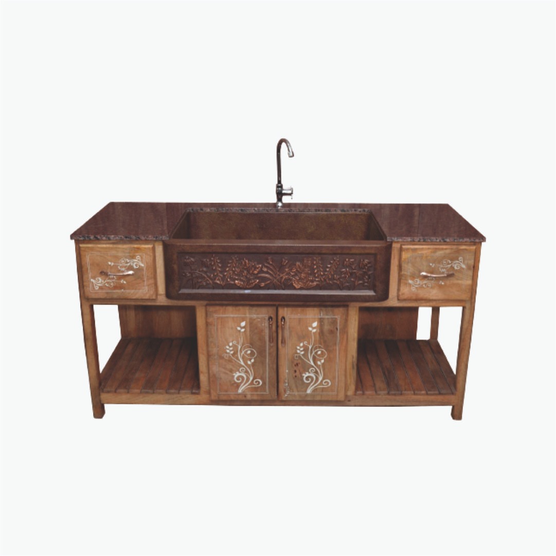 The Mason Copper Sink features a beautifully embossed plant design on its front panel, bringing a touch of nature-inspired elegance. Finished in antique copper, it exudes vintage charm while offering natural antibacterial properties.